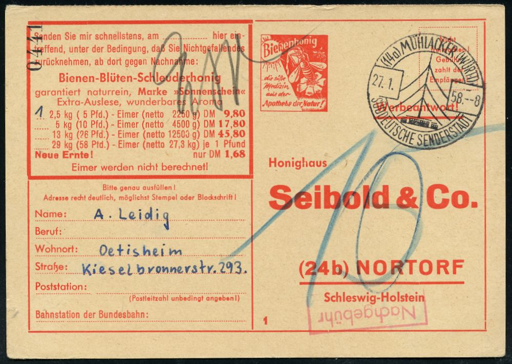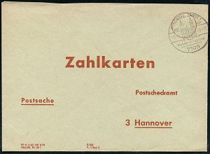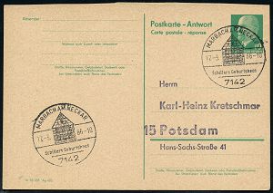 4138 | 12 € | POSTLEITRAUM 7100 (OHNE HEILBRONN u. LUDWIGSBURG) : (14a) MÜHLACKER (WÜRTT)/ SÜDDT. SENDERSTADT 1958 (27.7.) HWSt, Type II (Sendemast u -Haus) klar auf unfrankierter Antwort-Nachgebühr-Kt. (Bo.3 Ty.II) | ![]() | |