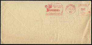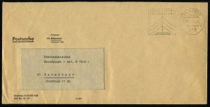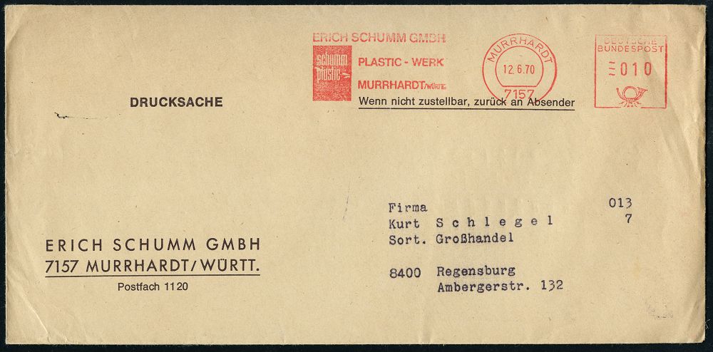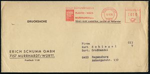 4142 | 10 € | POSTLEITRAUM 7100 (OHNE HEILBRONN u. LUDWIGSBURG) : 7157 MURRHARDT/ ERICH SCHUMM GMBH/ PLASTIC-WERK.. 1970 (12.5.) AFS Pitney-Bowes auf Firmen-Bf. (Dü.E-26E) | ![]() ![]() | |