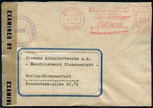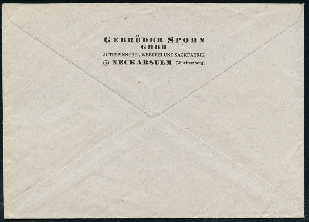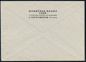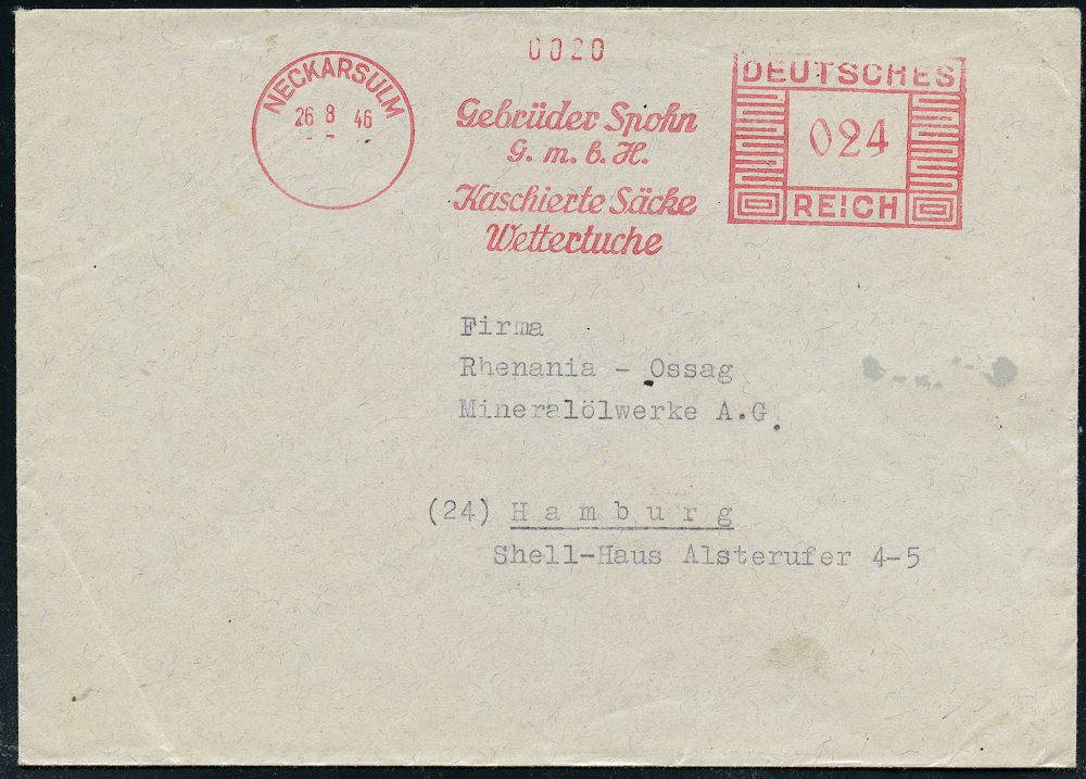 4143 | 28 € | POSTLEITRAUM 7100 (OHNE HEILBRONN u. LUDWIGSBURG) : NECKARSULM/ Gebrüder Spohn/ GmbH/ Kaschierte Säcke/ Wettertuch 1946 (26.8.) AFS Francotyp "Mäanderrechteck" unverändert weiterverwendet mit Inschrift "DEUTSCHES REICH" = Notmaßnahme! , rs. Abs.-Vordruckm Fern-Bf. (Dü.E-2CEh, unverändert!) | ![]() ![]() | |