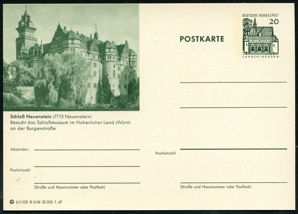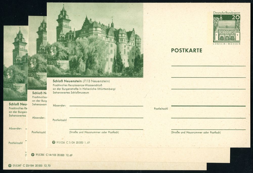 4152 | 14 € | POSTLEITRAUM 7100 (OHNE HEILBRONN u. LUDWIGSBURG) : 7113 Neuenstein 1969/70 20 Pf. BiP Lorsch, grün: Schloß Neuenstein in 3 Auflagen-Varianten , je ungebr. (Einzelverkauf möglich: je 5.- EUR) 3 Belege (Mi.P 00/C 3, C 14, C 23) | ![]() | |