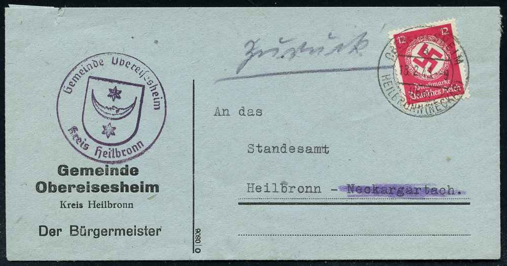 4154 | 25 € | POSTLEITRAUM 7100 (OHNE HEILBRONN u. LUDWIGSBURG) : OBEREISESHEIM/ a/ über/ HEILBRONN (NECKAR) 1943 (18.2.) 1K-Brücke auf seltener EF 12 Pf. lilarot Behördendienst + Dienst-HdN: Gemeinde Obereisesheim.. (Stadtwappen) klar gest. Retour-Bf. mit hs. Vermerk "Zurück" (Mi.D 172 b + 30.- EUR) | ![]() | |