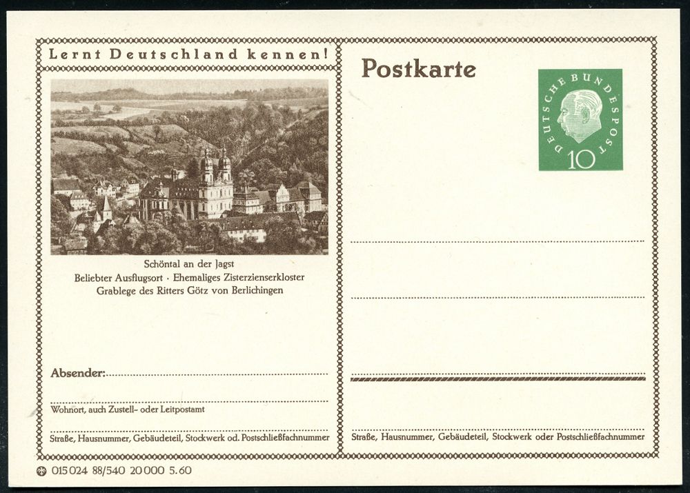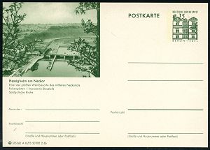 4160 | 6 € | POSTLEITRAUM 7100 (OHNE HEILBRONN u. LUDWIGSBURG) : Schöntal,Jagst 1960 10 Pf. BiP Heuss III, grün: ehem. Zisterzienserkloster.. Grablege Ritter Götz v. Berlichingen (Kloster u. Kirche) ungebr. (Mi.P 42/88-540) | ![]() | |