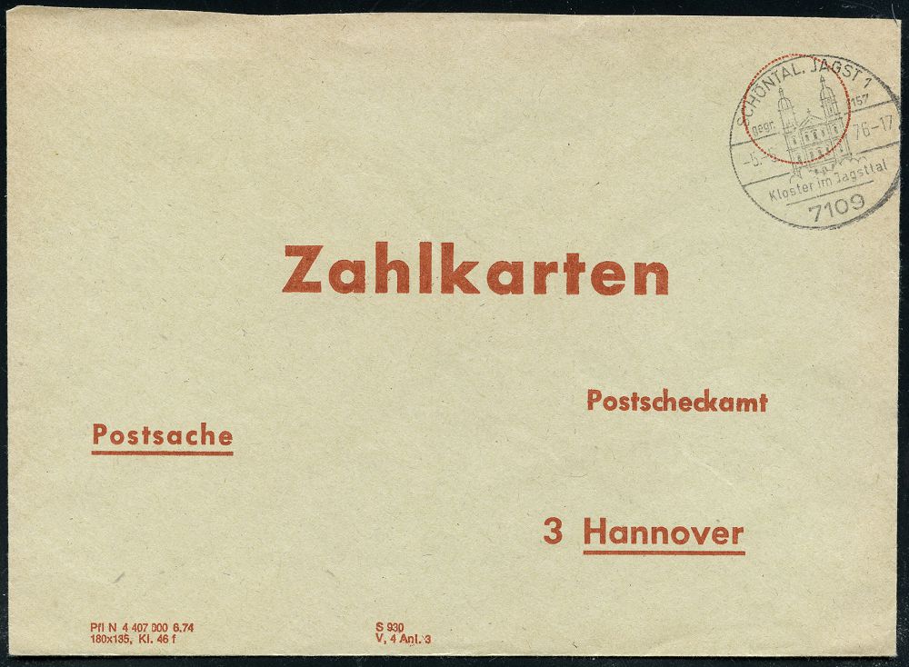 4161 | 16 € | POSTLEITRAUM 7100 (OHNE HEILBRONN u. LUDWIGSBURG) : 7109 SCHÖNTAL,JAGST 1/ Kloster im Jagsttal 1976 (5.5.) HWSt = Barockkirche des Zisterzienserklosters (= Grablege Ritter Götz v. Berlichingen) auf PSch-Innendienst-Bf.: Zahlkarten.. (grün/braun) für Zahlkartenaustausch!, seltene Verwendung! (Bo.2) | ![]() | |