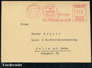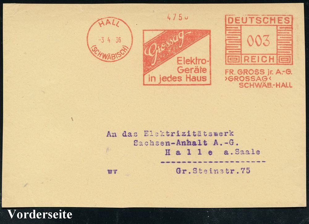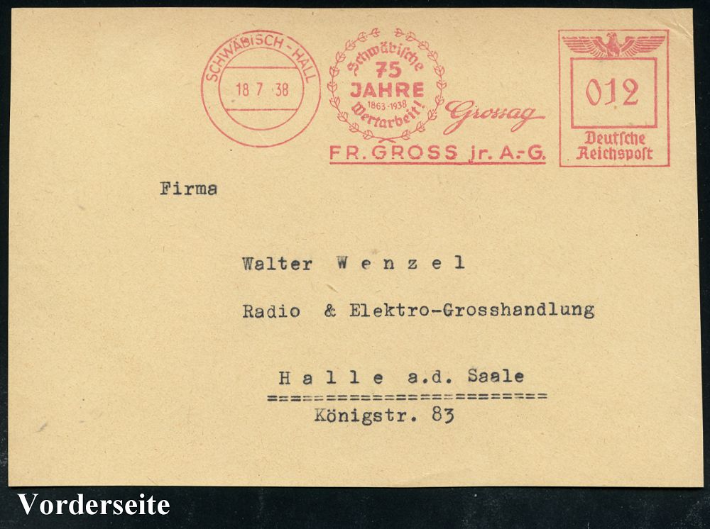 4166 | 28 € | POSTLEITRAUM 7100 (OHNE HEILBRONN u. LUDWIGSBURG) : Schwäbisch Hall 1936/38 AFS Francotyp "Mäanderrechteck" bzw. "Reichsadler": HALL/ (SCHWÄBISCH) bzw. SCHWÄBISCH-HALL/ Grossag/ FR. GROSS jr. A.G... (1x Jubil.-AFS "75 Jahre") je auf Firmen-Vorderseite, 2 Belege (Dü.E-2CEh, E-5CEo) | ![]() ![]() | |