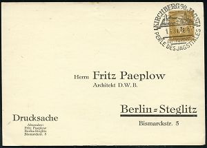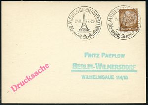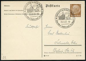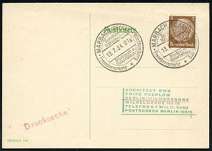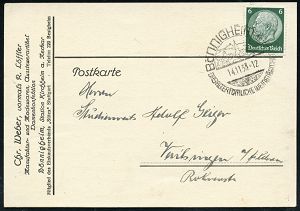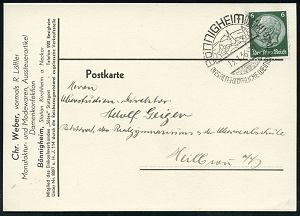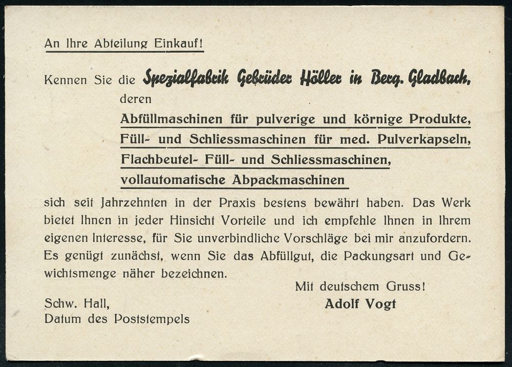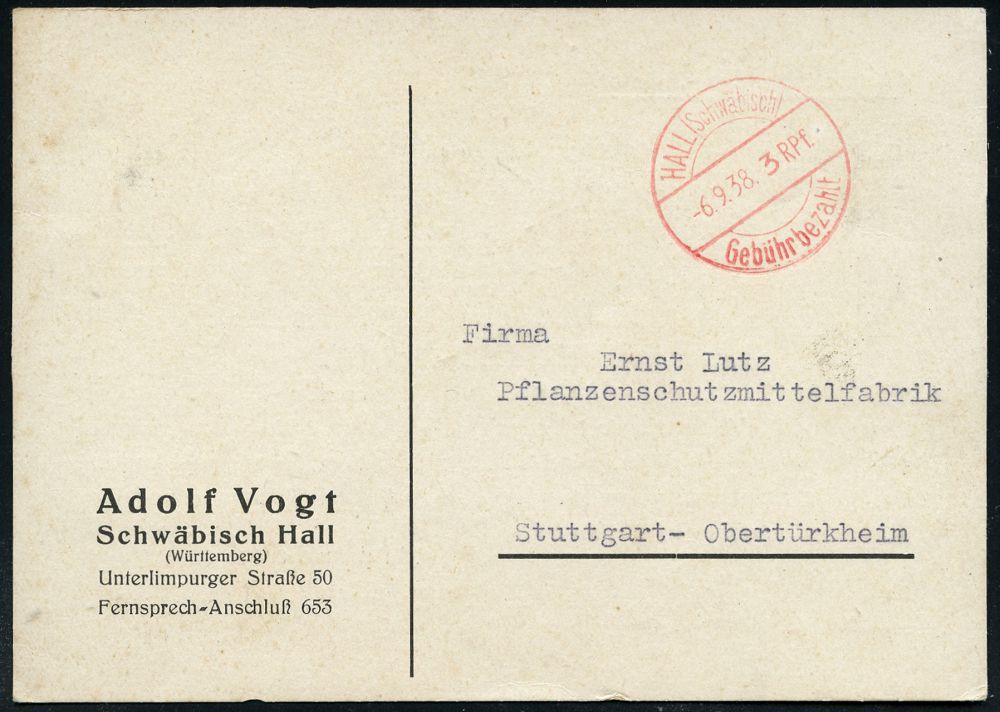 4167 | 15 € | POSTLEITRAUM 7100 (OHNE HEILBRONN u. LUDWIGSBURG) : Schwäbisch Hall 1938 (6.9.) 1K-Brücken-PFS: HALL HALL (Schwäbisch)/ 3 RPf./Gebühr bezahlt auf Firmen-Reklame-Karte: Adolf Vogt.. für Abfüll- und Schließmaschinen (Dü.A-6, Nr.25) | ![]() ![]() | |
