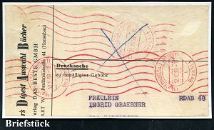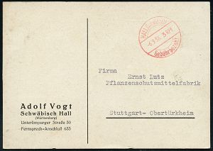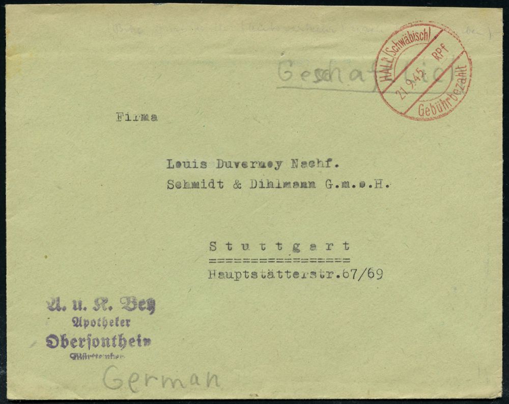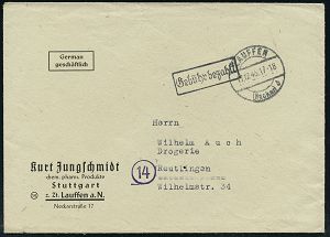 4057 | 16 € | POSTLEITRAUM 7100 (OHNE HEILBRONN u. LUDWIGSBURG) : LAUFFEN/ (Neckar)/ b 1945 (17.12.) 1K-Brücke + viol. Ra.: Gebühr bezahlt , klar gest. Firmen-Bf.: Kurt Jungschmidt, chem. pharm. Produkte, Stuttgart.. = noch kriegsbedingt, ausgelagerte Firma! | ![]() | |