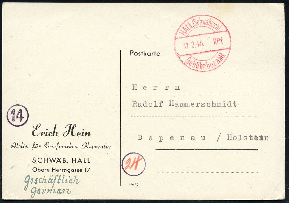 4170 | 15 € | POSTLEITRAUM 7100 (OHNE HEILBRONN u. LUDWIGSBURG) : Schwäbisch Hall 1946 (11.2.) 1K-Brücken-PFS: HALL (SCHWÄBISCH)/..RPf./Gebühr bezahlt o h n e Wertziffer auf Firmen-Kt.: Erich Hein, Atelier für Briefmarkenreparatur.. (Dü.A-6, Nr.25 ohne Wertangabe) | ![]() | |
