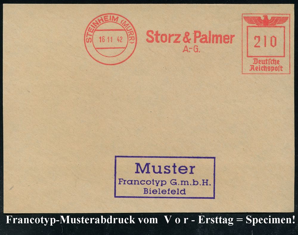 4176 | 35 € | POSTLEITRAUM 7100 (OHNE HEILBRONN u. LUDWIGSBURG) : STEINHEIM (MURR)/ Storz & Palmer/ A.-G. 1942 (16.11.) AFS,Musterabdruck Francotyp "Reichsadler" , glasklar gest. Francotyp-Musterblatt vom V o r - Ersttag! (mit Attest), selten! (Dü.E-5CGo) | ![]() ![]() | |