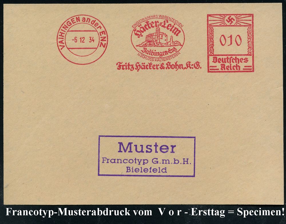 4178 | 35 € | POSTLEITRAUM 7100 (OHNE HEILBRONN u. LUDWIGSBURG) : VAIHINGEN AN DER ENZ/ Häcker-Leim../ Fritz Häcker & Sohn,K.G. 1934 (6.12.) AFS-Musterabdruck Francotyp "Hakenkreuz" (Firen-Logo: Schloß Kaltenstein) glasklar gest. Francotyp-Musterblatt vom V o r - Ersttag! (mit Attest), selten! (Dü.E-3CEo, Ortsstempel mit Groß- u. Kleinschreibung!) | ![]() ![]() | |