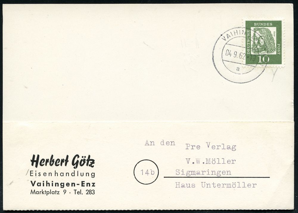 4182 | 9 € | POSTLEITRAUM 7100 (OHNE HEILBRONN u. LUDWIGSBURG) : VAIHINGEN (ENZ)/ a 1962 (4.9.) aptierter 2K-Steg = alte PLGZ entfernt klar auf Firmen-Kt.: Herbert Götz, Eisenhandlung.., Anschrift noch an alte PLZ (Mi.350 EF) | ![]() | |