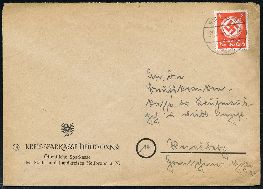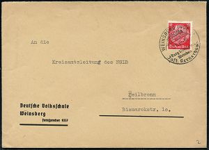 4187 | 50 € | POSTLEITRAUM 7100 (OHNE HEILBRONN u. LUDWIGSBURG) : WEINSBERG/ (Württ) 1945 (21.3.) 1K-Brücke auf EF 8 Pf. Behördendienst , sehr später Dienst-Bf.: (14) KREISSPARKASSE HEILBRONN.. (ausgelagert aus Kriegsgründen?), seltener, später Orts-Bf. (Mi.D 170 EF + 100.- EUR) | ![]() | |