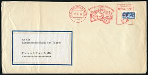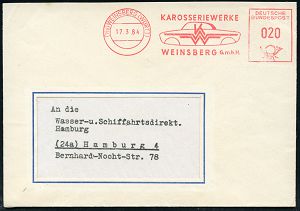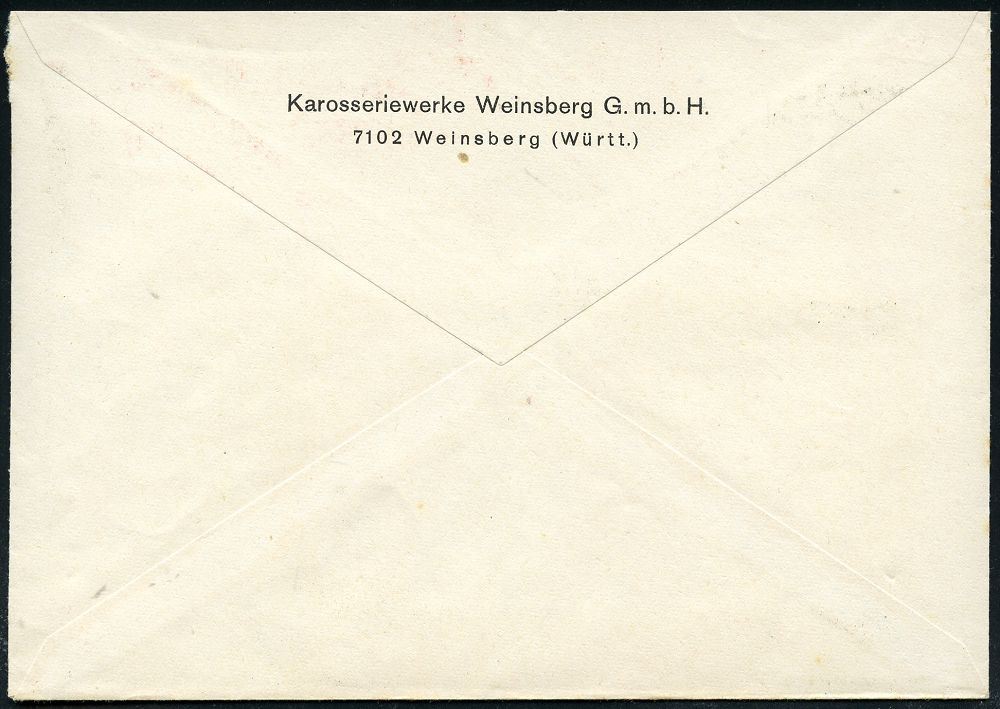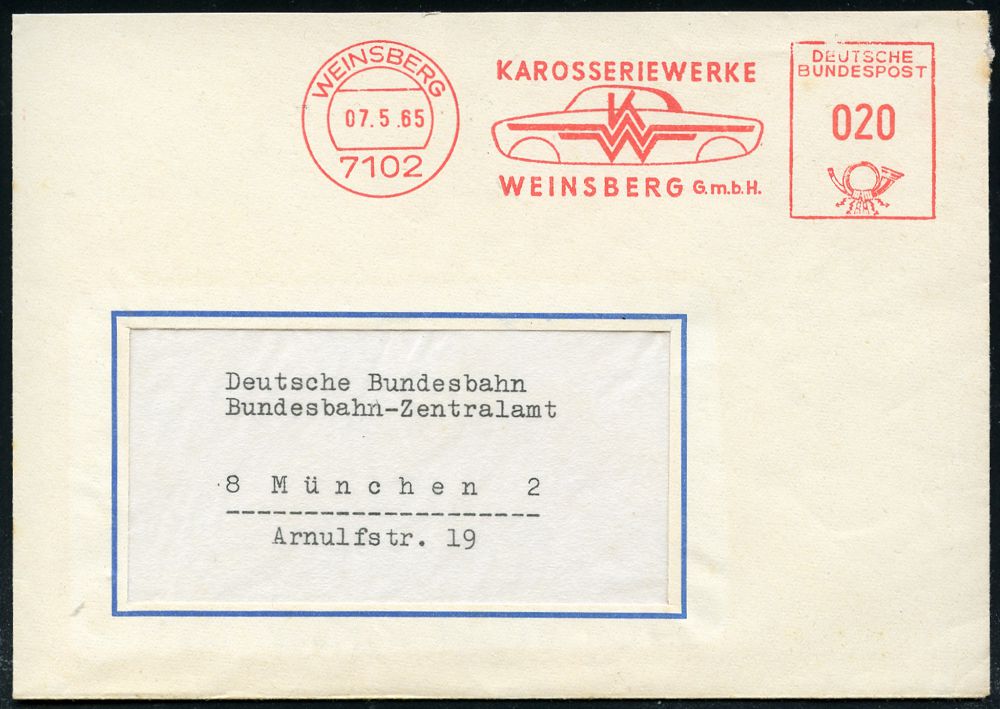 4191 | 12 € | POSTLEITRAUM 7100 (OHNE HEILBRONN u. LUDWIGSBURG) : (14a) WEINSBERG (WÜRTT)/ KAROSSERIEWERKE/ KW/ WEINSBERG GmbH 1961 (17.3.) AFS Francotyp "Posthorn" (PKW-Karosserie) rs. Abs.-Vordruck, Fern-Bf. (Dü.E-23CO) | ![]() | |