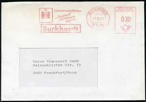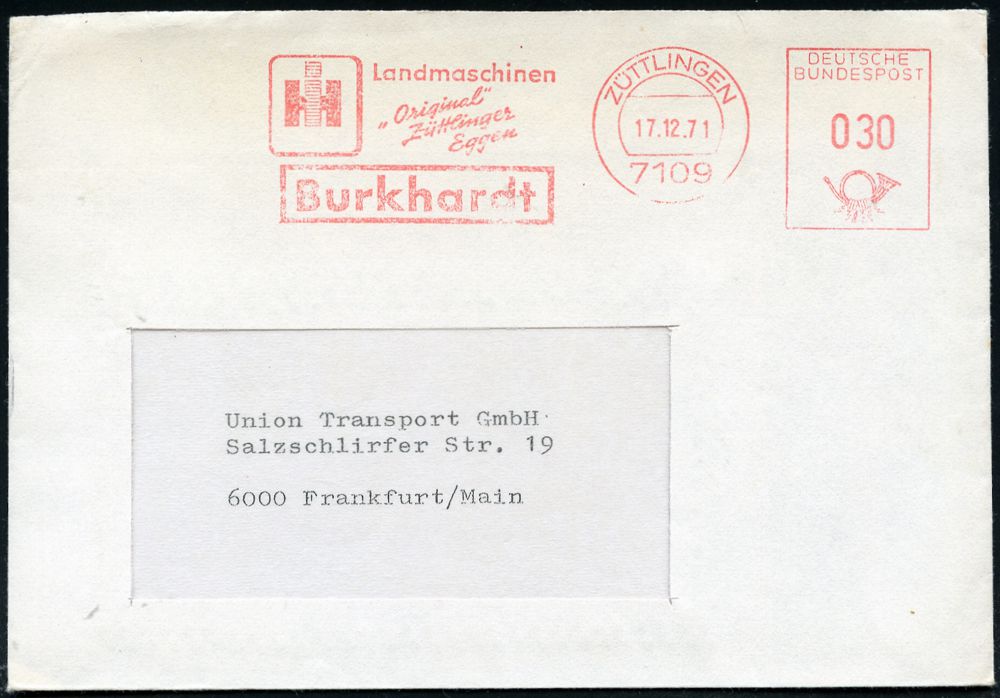 4197 | 8 € | POSTLEITRAUM 7100 (OHNE HEILBRONN u. LUDWIGSBURG) : 7109 ZÜTTLINGEN/ Landmaschinen../ Burkhardt 1971 (17.12.) AFS Francotyp "Posthorn" (Firmen-Logo) Fern-Bf. (Dü.E-26) | ![]() | |