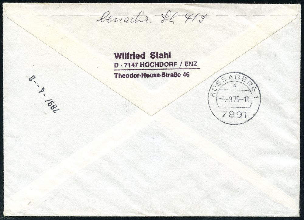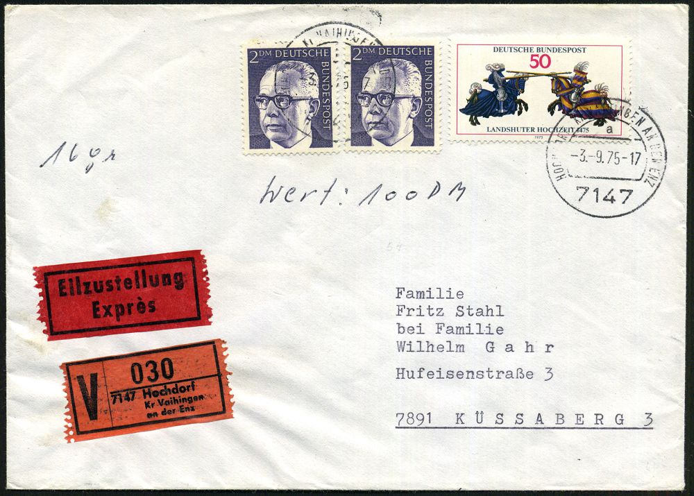 4040 | 20 € | POSTLEITRAUM 7100 (OHNE HEILBRONN u. LUDWIGSBURG) : 7147 HOCHDORF,KR VAIHINGEN AN DER ENZ/ a 1975 (3.9.) 1K-Segment (2x teils etw. undeutl.) + orange V-Zettel: 7147 Hochdorf/Kr Vaihingen/an der Enz (dreizeilig!), Inl.-Eil-Wert-Bf.!, rs. AS.: 7891 KÜSSABERG 1, seltene Portostufe! (Mi.2x 645 etc.) | ![]() ![]() | |