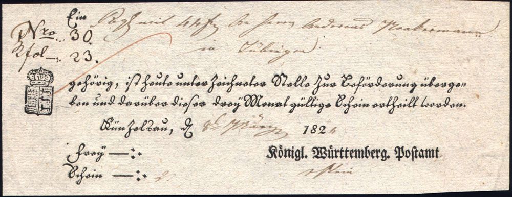 4048 | 18 € | POSTLEITRAUM 7100 (OHNE HEILBRONN u. LUDWIGSBURG) : Künzelsau 1824 (8.3.) Postschein, Ortsdruck: "Künzelsau.. Königl. Wuerttembg. Postamt" (Ortsdruck) mit. Wappen u. hs. Vermerke (Format 20,2 x 7,7 cm) | ![]() | |