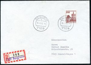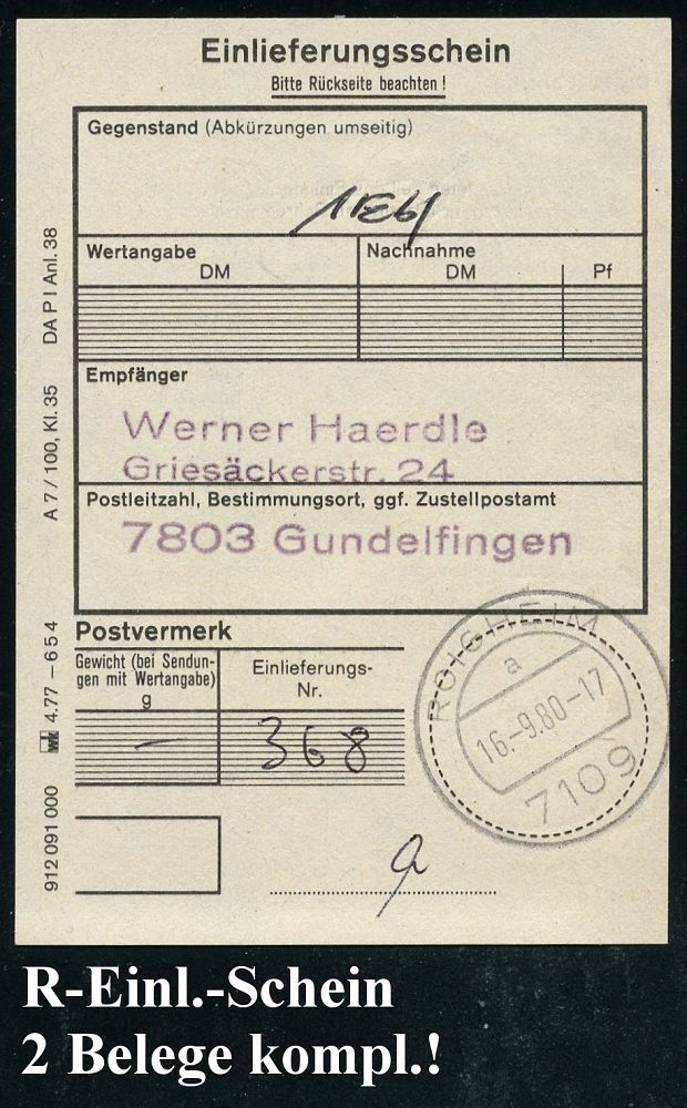 4158 | 16 € | POSTLEITRAUM 7100 (OHNE HEILBRONN u. LUDWIGSBURG) : 7109 ROIGHEIM/ b 1980 (16.9.) 1K-Segment 2x + provis. RZ: 7109 Roigheim (viol. 1L auf Blanco-RZ) klar gest. Inl.-R-Bf. + R-Einl.-Schein, 2 Belege kompl.! (Mi.998 EF) | ![]() ![]() | |