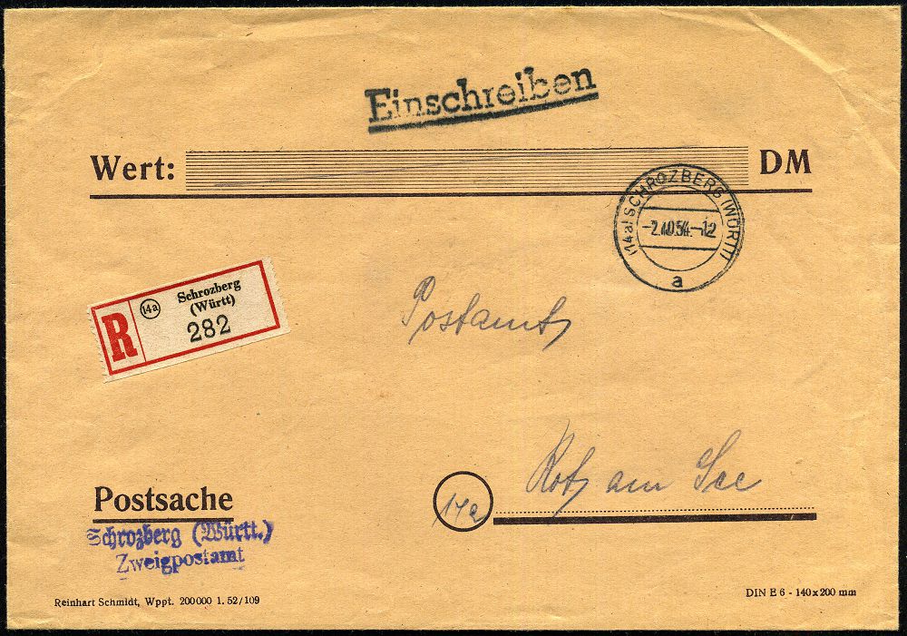 4162 | 18 € | POSTLEITRAUM 7100 (OHNE HEILBRONN u. LUDWIGSBURG) : (14a) SCHROZBERG (WÜRTT)/ a 1954 (2.10.) 2K-Steg + RZ: (14 a) Schrozberg/(Württ) + viol. 2L: Schrozberg (Württ.)/ Zweigpostamt, sauber gest. Postdienst-R-Bf. | ![]() | |