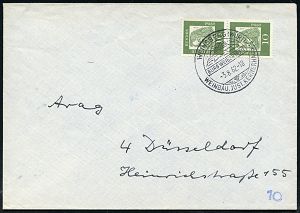 3994 | 15 € | POSTLEITRAUM 7100 (OHNE HEILBRONN u. LUDWIGSBURG) : Aurich/ bei Vaihingen an der Enz 1952 (16.2.) viol. Ra.2 = PSt.II + HWSt: (14 a) VAIHINGEN (ENZ)/ALTES STÄDTCHEN/ NEUES SCHWIMMBAD.. auf EF 20 Pf. Posthorn + 2 Pf. NoB, kleiner Inl.-Fern-Bf. (Bo.1) | ![]() | |