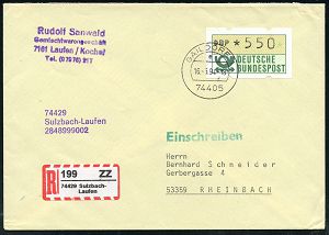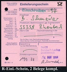 4033 | 18 € | POSTLEITRAUM 7100 (OHNE HEILBRONN u. LUDWIGSBURG) : 74405 GAILDORF 1/ e 1994 (16.5.) 1K-Segment auf ATM 550 Pf. , EF + Selbstklebe-RZ: 74429 Sulzbach-/Laufen/z z (nur kurze Verwendungszeit !) + viol. 3L, Inl.-R-Bf. + R-Einl.-Schein kompl. (2 Belege kompl.!) | ![]() ![]() | |