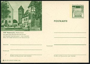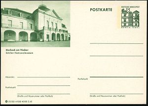 4123 | 15 € | POSTLEITRAUM 7100 (OHNE HEILBRONN u. LUDWIGSBURG) : 7142 MARBACH (NECKAR)/ Schillers Geburtshaus 1965 (27.10.) HWSt = Schiller-Museum, 2x auf DDR-Antwort-P. 10 Pf. Ulbricht , zulässige Inl.-Antwort-Karte, seltene Verwendung! (Bo.9) | ![]() | |