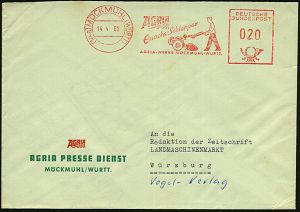 4130 | 12 € | POSTLEITRAUM 7100 (OHNE HEILBRONN u. LUDWIGSBURG) : (14a) MÖCKMÜHL (WÜRTT)/ AGRIA/ Einachs-Schlepper/ AGRIA-WERKE 1961 (14.4.) AFS Francotyp = Einachs.-Motorpflug , klar gest. Firmenbf. (Dü.E-23CO) | ![]() | |