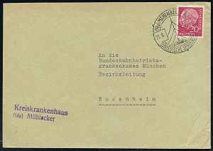 4137 | 10 € | POSTLEITRAUM 7100 (OHNE HEILBRONN u. LUDWIGSBURG) : (14a) MÜHLACKER (WÜRTT)/ SÜDDT. SENDERSTADT 1956 (21.8.) HWSt, Type II (Sendemast u. -Haus) viol. 2L: Kreiskrankenhaus/ (14 a) Mühlacker, Fern-Bf. (Bo.3 Ty.II) | ![]() | |