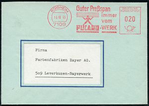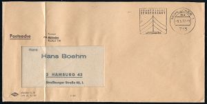 4157 | 14 € | POSTLEITRAUM 7100 (OHNE HEILBRONN u. LUDWIGSBURG) : 7109 ROIGHEIM/ Guter Preßspan/ ..PUCARO-WERK 1963 (15.10.) AFS Francotyp "Posthorn" (Figur mit gr. Pappe oder Pre0span) Fern-Bf., vergl. Kat.Nr. 4156 (Dü.E-23CO) | ![]() | |