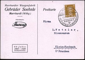 4141 | 25 € | POSTLEITRAUM 7100 (OHNE HEILBRONN u. LUDWIGSBURG) : MURRHARDT/ KURORT/ FESTSPIELE AM RÖMERWALL 1928 (13.7.) gesuchter HWSt auf dekorativer Firmen-Reklame-Kt.: Murrhardter Waagenfabrik, Gebr. Soehnle.. (Bo.1) | ![]() ![]() | |