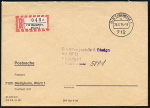 4012 | 14 € | POSTLEITRAUM 7100 (OHNE HEILBRONN u. LUDWIGSBURG) : 712 BIETIGHEIM 1/ c 1974 (28.3.) 1K-Segment + RZ: 712 Bietigheim,/Württ 1/d auf Postdienst-Bf. Ortsdruck: 7120 Bietigheim.. + viol. Anschriften 4L: Ermittlungsstelle f. Bfsdgn/d.OPD.., klar gest. Fern-R-Bf. | ![]() | |
