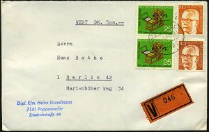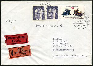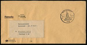 4155 | 20 € | POSTLEITRAUM 7100 (OHNE HEILBRONN u. LUDWIGSBURG) : 7141 POPPENWEILER/ o 1972 (15.5.) 1K-Segment auf 250 Pf.-Frankatur + stummer roter V-Zettel o h n e Ort (nur Nr.) gesiegelter Fern-Wert-Bf. 500.- DM (n. West-Berlin) | ![]() ![]() | |