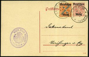 4175 | 16 € | POSTLEITRAUM 7100 (OHNE HEILBRONN u. LUDWIGSBURG) : SERSHEIM/ *(WÜRTT.)* 1921 (4.8.) 1K auf Dienst-P 10 Pf. Württemberg Abschied + Zusatzfrankatur 30 Pf. + viol., aptierter Oval-HdN: WÜRTT. EVANG. PFARRAMT.. (KGL. entfern, aber noch königl. Wappen) Fern-Kt. (Mi.DP 14/01 + Mi.D 61 + 16.50 EUR) | ![]() | |