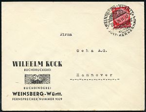 4016 | 18 € | POSTLEITRAUM 7100 (OHNE HEILBRONN u. LUDWIGSBURG) : BÖNNIGHEIM (Württ)/ DAS ALTERTÜMLICHE WEINSTÄDTCHEN 1936 (13.1.) HWSt (Ortsbild) klar auf Firmen-Kt.: Chr. Weber, vormals R. Löffler, Manufaktur- u. Modewaren.. (Bo.1, Bochmann 1936 unbekannt!) | ![]() | |