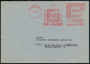 4000 | 30 € | POSTLEITRAUM 7100 (OHNE HEILBRONN u. LUDWIGSBURG) : BACKNANG/ IFA-GARNE/ 100 JAHRE/ J.F.ADOLFF/ AG 1948 (8.1.) unverändert weiterverwendeter AFS Francotyp "Mäanderrechteck" mit Inschrift "DEUTSCHES REICH" (3 Garnrollen, Lorbeer) rs. Abs.-Vordruck, Fern-Bf. (Dü.E-2BAh unverändert) | ![]() | |