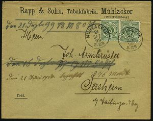 4132 | 28 € | POSTLEITRAUM 7100 (OHNE HEILBRONN u. LUDWIGSBURG) : MÜHLACKER 1899 (21.12.) 1K auf 2x 5 Pf. Württembg. auf Firmen-Bf.: Rapp & Sohn Tabakfabrik.. + Inhalt: dekorat. Briefbogen mit Sieger-Medaillen, Expo Paris, Napoleon III. u. Wien, 2 Belege kompl.! (Mi.56 MeF) | ![]() ![]() | |