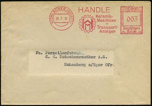 4135 | 20 € | POSTLEITRAUM 7100 (OHNE HEILBRONN u. LUDWIGSBURG) : MÜHLACKER (WÜRTT)/ HÄNDLE/ Keramik-/ Maschinen.. 1936 (31.7.) AFS Francotyp "Hakenkreuz" (Zahnrad-Logo) klar gest. Fernbf. (Dü.E-3CEo) | ![]() | |