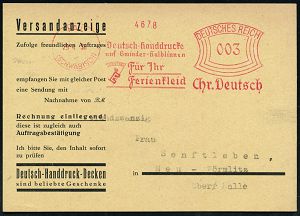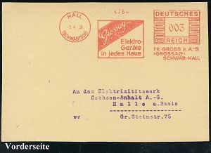 4165 | 20 € | POSTLEITRAUM 7100 (OHNE HEILBRONN u. LUDWIGSBURG) : SCHWÄBISCH HALL 1936 (29.4.) AFS Francotyp "Bogenrechteck": HALL/(SCHWÄBISCH)/Deutsch-Handdrucke/auf Gminder-Halblinnen/Für Jhr/Ferien-kleid/Chr.Deutsch (Logo) klar gest. Firmen-Kt.:: Versandanzeige.. (Dü.E-1CEh) | ![]() | |