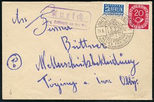 4188 | 16 € | POSTLEITRAUM 7100 (OHNE HEILBRONN u. LUDWIGSBURG) : WEINSBERG/ (Württ) 1946 (16.2.) 1K-Brücke + roter Ra.: Gebühr bezahlt (Fraktur) + provis. RZ: Weinsberg (Württ) = viol. 1L auf Blanco-RZ m. PLZ-Kreis, Inl.-R-Bf. n. Stuttgart (Richter Nr.1210) | ![]() | |
