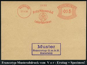 3997 | 35 € | POSTLEITRAUM 7100 (OHNE HEILBRONN u. LUDWIGSBURG) : BACKNANG/ Fritz Häuser AG/ Lederfabrik 1928 (27.8.) AFS-Musterabdruck Francotyp "Bogenrechteck" (Firmen-Logo) glasklar gest. Francotyp-Musterblatt vom V o r - Ersttag! (mit Attest), selten! (Dü.E-1BAh) | ![]() ![]() | |