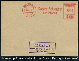 3999 | 35 € | POSTLEITRAUM 7100 (OHNE HEILBRONN u. LUDWIGSBURG) : BACKNANG/ Robert Schweizer/ Lederfabrik 1936 (20.1.) AFS-Musterabdruck Francotyp "Reichsadler" , glasklar gest. Francotyp-Musterblatt vom V o r - Ersttag! (mit Attest), selten! (Dü.E-5CGo) | ![]() ![]() | |