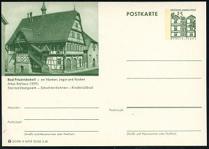 4003 | 5 € | POSTLEITRAUM 7100 (OHNE HEILBRONN u. LUDWIGSBURG) : Bad Friedrichshall 1965 15 Pf. BiP Tegel, grün: Altes Rathaus.. (Fachwerkhaus) ungebr. (Mi.P 86/A 14-107) | ![]() | |