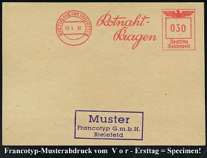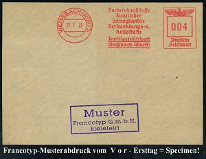 4195 | 35 € | POSTLEITRAUM 7100 (OHNE HEILBRONN u. LUDWIGSBURG) : WEISSBACH (WÜRTT)/ Bucheinbandstoffe/ Kunstleder../ Verdunklungs-u./ Rollostoffe/ Textilgesellschaft/ Weißbach.. 1939 (27.7.) AFS-Musterabdruck Francotyp "Reichsadler" , glasklar gest. Francotyp-Musterblatt vom V o r - Ersttag! (mit Attest), selten! (Dü.E-5CGo) | ![]() ![]() | |