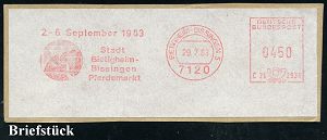 4013 | 8 € | POSTLEITRAUM 7100 (OHNE HEILBRONN u. LUDWIGSBURG) : 7120 BIETIGHEIM-BISSINGEN 5/ 2.-6.Sept.1983/ ..Pferdemarkt 1983 (29.7.) AFS Francotyp mit Kennung (Logo) auf Briefstück (Dü.E-26, nur kurze Verwendungszeit!) | ![]() | |