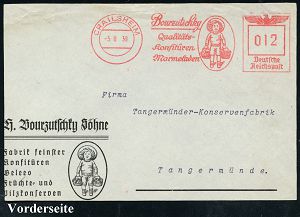 4023 | 18 € | POSTLEITRAUM 7100 (OHNE HEILBRONN u. LUDWIGSBURG) : CRAILSHEIM/ Bourzutschky/ Qualitäts-/ Konfitüren/ Marmeladen 1939 (5.8.) AFS Francotyp "Reichsadler" (Kind mit Sonnenhut u. Körben mit Garten-u.Waldfrüchten) glasklar gest. motivgl. Firmen-Vorderseite (Dü.E-5CG) | ![]() | |