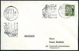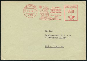 4028 | 14 € | POSTLEITRAUM 7100 (OHNE HEILBRONN u. LUDWIGSBURG) : 718 CRAILSHEIM/ 127 JAHRE/ FRÄNK./ VOLKSFEST/ ..20.-23.SEPT. 1968 (2.9.) AFS Francotyp "Posthorn" (Mann in Tracht mit Hut u. Regenschirm) klar gest. Fern-Bf. (Dü.E-23CG, nur kurze Verwendungszeit) | ![]() | |