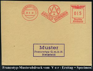 4030 | 35 € | POSTLEITRAUM 7100 (OHNE HEILBRONN u. LUDWIGSBURG) : ERNSBACH (WÜRTT)/ L A & C/ ARNOLD-SCHRAUBEN 1938 (26.9.) AFS-Muster Francotyp "Reichsadler" (Monogr.-Logo aus Schrauben) glasklar gest. Francotyp-Musterblatt vom V o r - Ersttag! (mit Attest), selten! (Dü.E-5CGo) | ![]() ![]() | |