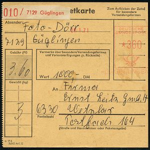 4038 | 16 € | POSTLEITRAUM 7100 (OHNE HEILBRONN u. LUDWIGSBURG) : =pa= GÜGLINGEN 1971 (20.1.) Paket-FS Francotyp "Posthorn" 360 Pf. + roter Wertpaket-Zettel: 7129 Güglingen , Inl.-Wertpaket-Kt. "1000.- DM" n. Wetzlar, rs. AS., seltene Portostufe! (Dü.H-6 C) | ![]() ![]() | |