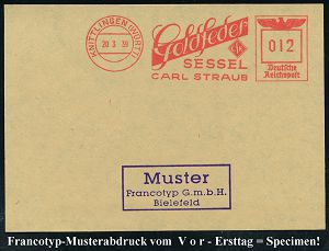 4045 | 35 € | POSTLEITRAUM 7100 (OHNE HEILBRONN u. LUDWIGSBURG) : KNITTLINGEN (WÜRTT)/ Goldfeder/ SESSEL/ CARL straub 1938 (29.3.) AFS-Musterabdruck Francotyp "Reichsadler" (Monogr.-Logo) glasklar gest. Francotyp-Musterblatt vom V o r - Ersttag! (mit Attest), selten! (Dü.E-5CGo) | ![]() ![]() | |
