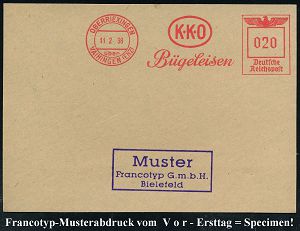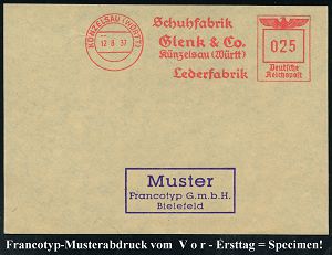 4049 | 35 € | POSTLEITRAUM 7100 (OHNE HEILBRONN u. LUDWIGSBURG) : KÜNZELSAU (WÜRTT)/ Schuhfabrik/ Glenk & Co./ ..Lederfabrik 1937 (12.8.) AFS-Musterabdruck Francotyp "Reichsadler" , glasklar gest. Francotyp-Musterblatt vom V o r - Ersttag! (mit Attest), selten! (Dü.E-5CGo) | ![]() ![]() | |
