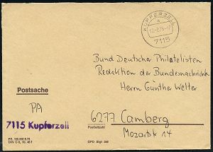4054 | 8 € | POSTLEITRAUM 7100 (OHNE HEILBRONN u. LUDWIGSBURG) : 7115 KUPFERZELL/ a 1975 (12.2.) 1K-Segment + viol. 1L: 7115 Kupferzell , klar gest. Postdienst-Bf. n. Camberg | ![]() | |
