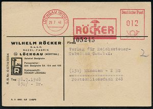 4063 | 15 € | POSTLEITRAUM 7100 (OHNE HEILBRONN u. LUDWIGSBURG) : LÖCHGAU (WÜRTT)/ RÖCKER 1948 (29.7.) AFS Francotyp "Posthorn" Deutsche Post (Schraube, kein Pilz!) motiv-ähnl. Firmen-Kt.: WILHELM RÖCKER GmbH, NAGEL-FABRIK.. (Dü.E-20CG) | ![]() | |